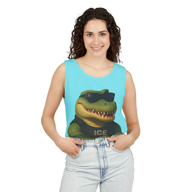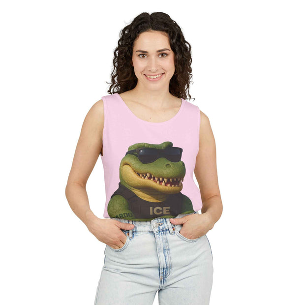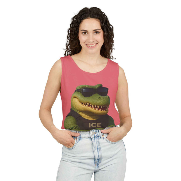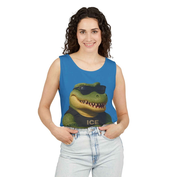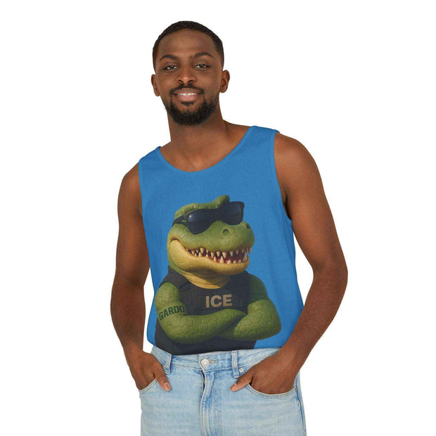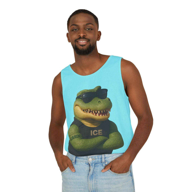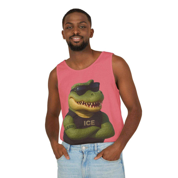 The Unisex, Agent Gardo, Alligator Alcatraz Tank-Top features a striking alligator graphic, inspired by summer fun and wildlife. This eye-catching design is not only visually appealing but also reflects your unique personality and love for nature.